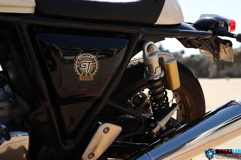 그러나 굳이 카페레이서 헤리티지를 들먹이지 않아도 좋다. 이미 초창기 모델에서 크게 벗어나지 않는 라인을 지금까지 이어온 것이고, 이를 모른다 하더라도 컨티넨탈GT의 심플하고 직관적인 디자인이 클래식 감성을 자극하기에 충분하다. 양쪽으로 길게 그러면서도 위쪽으로 각을 추킨 듀얼 머플러가 병렬 트윈 엔진임을 표현했다. 단정한 스티치로 마무리한 시트는 리어라인을 캐노피로 깔끔하게 마무리하면서 머플러와 함께 당당하고 스포티한 뒤태를 완성했다.
