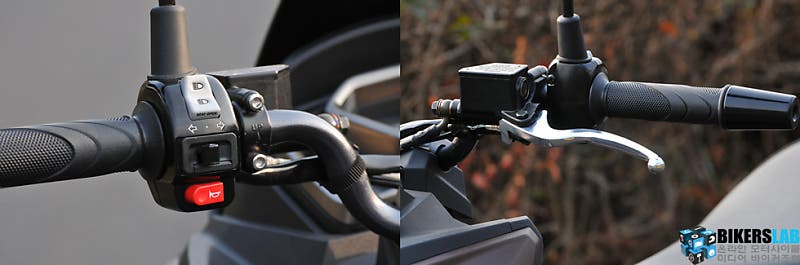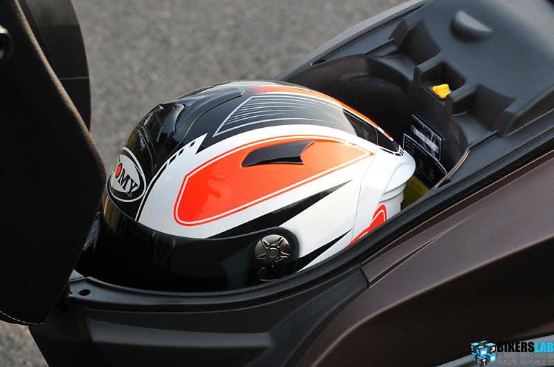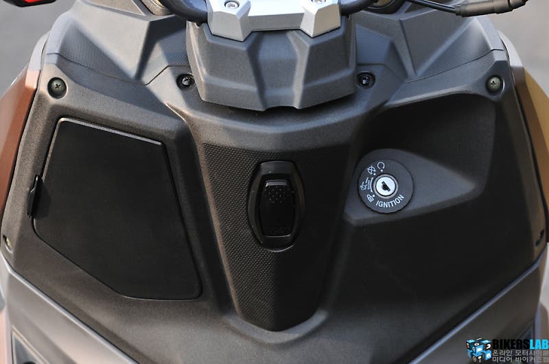 프론트에는 수납공간과 봉투를 걸 수 있는 고리를 마련해 편의성을 확보했다. 7.5L의 연료탱크는 시트 밑에 자리한다. 때문에 러기지박스는 헬멧 하나를 보관할 수 있는 정도의 크기다. 그래도 플로어 패널의 공간을 확보해, 운행 시 발을 편하게 올려놓을 수 있으면서도 필요에 따라 짐을 얹을 수 있도록 했다. 경쟁기종과는 다른 구성이기에 각각의 특장점도 다르다. 하나의 버튼으로 상향등과 시트 오픈 기능을 겸용으로 사용할 수 있게 한 부분은 나름의 편의성을 더한 부분이다.