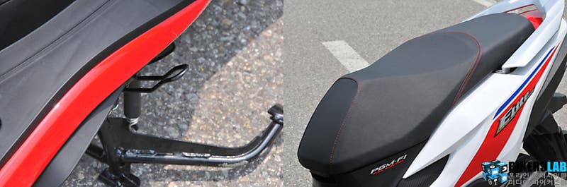 엘리트는 화이트, 블랙, 트리컬러의 총 세 가지 색상으로 출시했는데, 시승기종은 트리컬러 버전으로 카울 하나하나의 선명함이 도드라진다. 머플러를 덮은 카울과 마감도 저렴한 티를 내지 않으려고 노력한 티가 드러나며, 시트에도 레드 컬러의 스티치를 넣어 심심함을 달랬다. 특히 차체 곳곳에 카본패턴을 적용해 스포티함을 부각시킨 점이 매력이다. 동승자를 위한 발판은 일체형이다. 리어 쇽업소버도 레드 컬러의 스프링으로 포인트를 줬다.