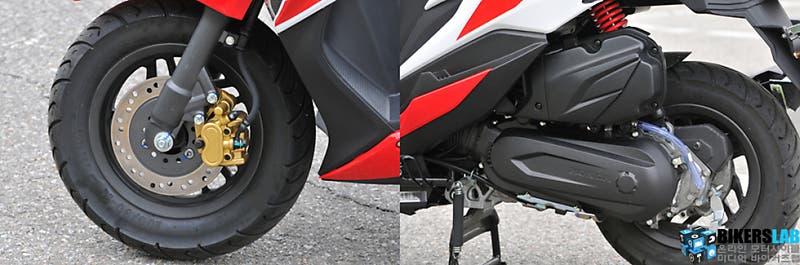 CBS(Combined Brake System)브레이크는 안정적이다. 브레이크 레버를 움켜 쥐었을 때 나오는 제동력의 크기가 크지는 않으나, 레버를 조작함에 따라 제법 신속하게 반응한다. 게다가 리어 브레이크를 잡으면 전/후륜에 이상적으로 힘이 배분되기에 브레이킹 시의 안정감도 준수하다. 서스펜션은 전륜에 텔레스코픽과 리어에 모노 쇽업소버를 사용하며, 일반적인 저배기량 스쿠터의 성능과 크게 다르지 않은 움직임을 보인다.